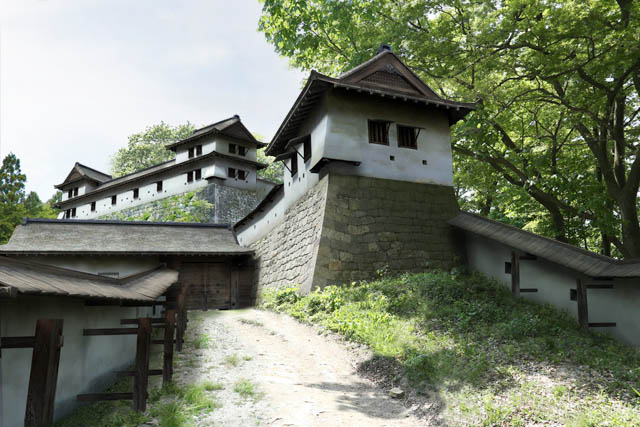 村上城を象徴するような遺構である出櫓跡の石垣上には、正徳年間の実測記録「村上御城廓」によると、平面規模が2間5尺×3間2尺の櫓が上げられていた。二重櫓か平櫓かは資料によって分かれるところであるが、ここでは『お城山とその周辺整備基本計画』所収の文化財建造物保存技術協会の復元案に従って平櫓とした(他の櫓の形状を勘案すれば、1、2階が同大の重箱櫓だった可能性も高いと思う。村上市「史跡村上城跡出櫓台整備報告書」2018,03 においては、「重層だった蓋然性が高い」としている)。また、画面上では見えていないが、同じく「村上御城廓」からは、小規模な多聞櫓が南側に接続していたことが判明する。 こちらの規模は、1間半×2間2尺で、近年の石垣修理に伴う発掘調査で記録通りの規模が確認されている。