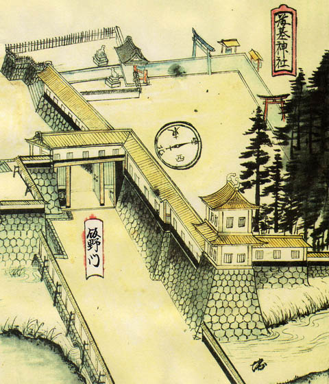 門本体に多聞櫓2棟と二重櫓をL字型に接続。(「村上城城門絵図」平野邦広氏所蔵)