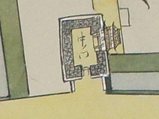 中ノ門が巨大な枡形を置いたのは、直近の羽黒門の支援を意図したからであろうか。(村上市所蔵「明治元年内藤候治城明治維新時代村上地図」)