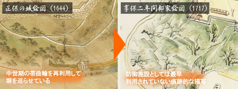 ただし、防御施設としては使われていないものの、遺構の存在自体は把握されていたようです。同位置を比較してみると、概念的な描写ながら段郭の存在がしっかりと描かれています。また、塀は失われたものの、井戸がある一角(馬冷やし場)の周囲には背の高い杉木立(?)が周辺の樹木とは明らかに描法を変えて描かれており、一応は視線を遮るような配慮がなされていたことが読み取れます。