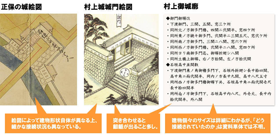※「内藤侯治城明治維新時代村上地図」が建物平面を描いてはいるのだが、描写が概して記号的であることや、サイズの問題から、個々の建物の詳細な構造を見るのは難しい。